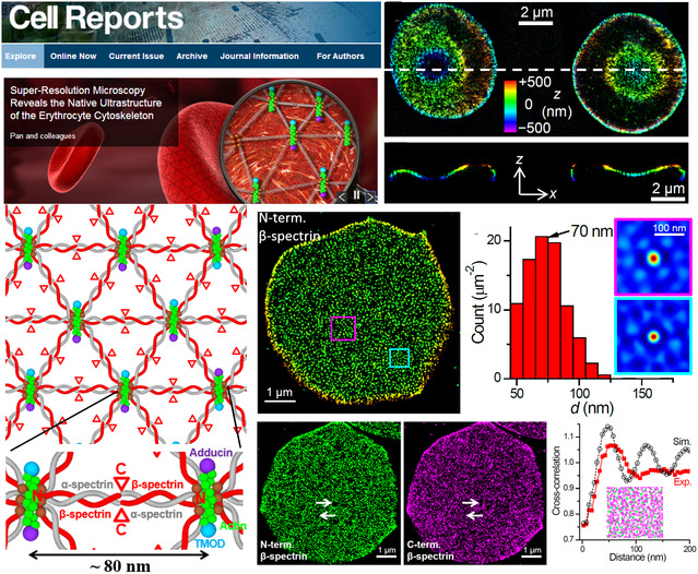 红细胞是人血液中数量最多的一种细胞,主要负责氧气和二氧化碳的运输,保障生命活动正常进行。红细胞呈现特有的双凹圆饼状形态并具有极强的变形性和稳定性,保证其在120天寿命中往返动静脉上百万次,行程约480km循环过程中不断承受大血管中的流体剪切力和比自己直径还小的毛细血管挤压力而不破损。红细胞虽已被人类认知300多年,但是诸多的机制仍尚不清楚,如细胞形态、变形性与细胞骨架的关系等。近日,我院潘雷霆副教授与合作者美国加州大学伯克利分校Ke Xu教授基于超分辨光学成像技术在红细胞骨架结构与特性研究方面获重要进展,相关结果以“Super-Resolution Microscopy Reveals the Native Ultrastructure of the Erythrocyte Cytoskeleton”为题发表在国际知名学术期刊《Cell Reports》。