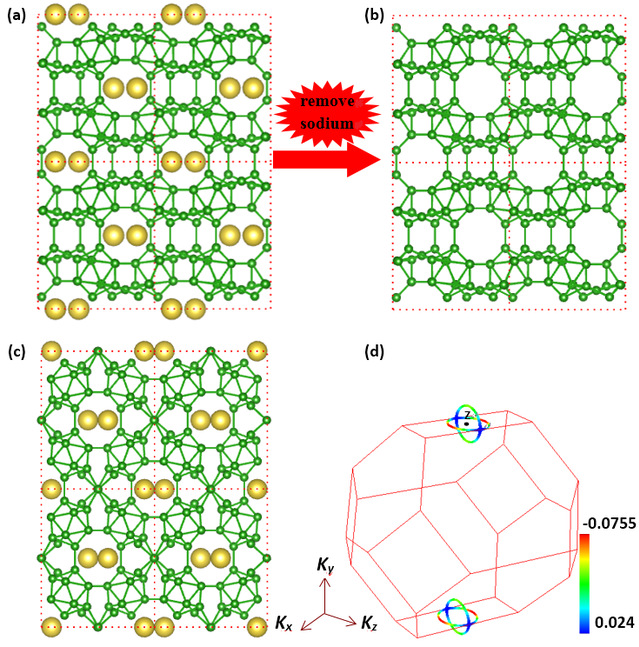 贵金属硼化物是一类具有强耐磨性、抗腐蚀性、耐高温、高硬度的多功能材料,关于贵金属硼化物的研究较为深刻和广泛。碱金属硼化物,作为潜在的新型电池负极材料、储氢或超导材料等也颇受关注。该类化合物的典型代表,钠硼化合物Na2B30Na2B29早在1969年就被合成,迄今近50年,然而有关它的基态晶体结构和电子性质还存在争议。基于进化算法结构预测软件USPEX的变组分模块,意外发现实验合成的Imma-Na2B30并不是基态结构,而是另一个正交相I212121-Na2B30,两者皆由Na原子,B12团簇和填隙B原子构成。与Imma-Na2B30的三角形填隙硼单元不同,I212121-Na2B30的填隙B原子形成螺旋状硼链。如此细小的结构差别导致XRDHRTEM很难区分,因为I212121-Na2B30Imma-Na2B30具有非常接近的晶格常数。有意思的是,细小的结构差别竟然产生完全不同的电子性质。一直以来Imma-Na2B30被视为金属性材料,第一性原理计算发现Imma-Na2B30是拓扑节线半金属。基于紧束缚模型的WannierTools软件显示第一布里渊区有两个正交的nodal rings分别位于kxkzkykz平面内,受时间-空间反演保护,具有潜在的优越输运性质。与之对比,I212121-Na2B30是具有1.6 eV带隙的间接半导体,根据微观硬度模型,理论Vickers硬度约为37.4GPa,接近超硬材料(> 40GPa)。此外,I212121-Na2B30的三维硼网格具有开放式骨架结构,Na原子位于沿[010]晶向的特殊通道中,若I212121-Na2B30被实验合成,通过退火蒸发Na原子的办法,有望获得新型亚稳单质硼(B30)