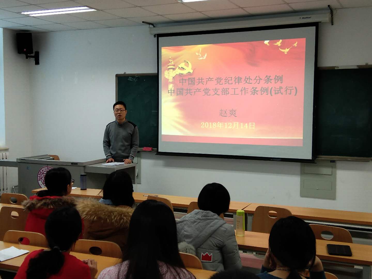 12月14日,性爱视频 学生党总支在三教105进行集中理论学习,专题学习《中国共产党纪律处分条例》和《中国共产党支部工作条例(试行)》。学生党总支书记赵爽主持并领学,学生党总支委员、学生党员参加本次学习。