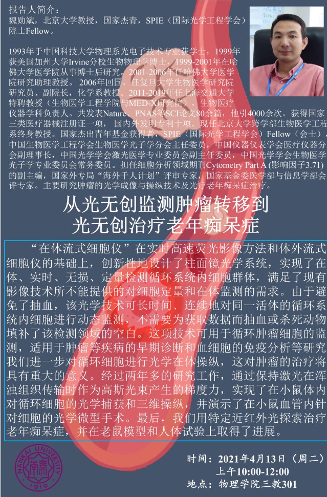 【学术报告】从光无创监测肿瘤转移到光无创治疗老年痴呆症