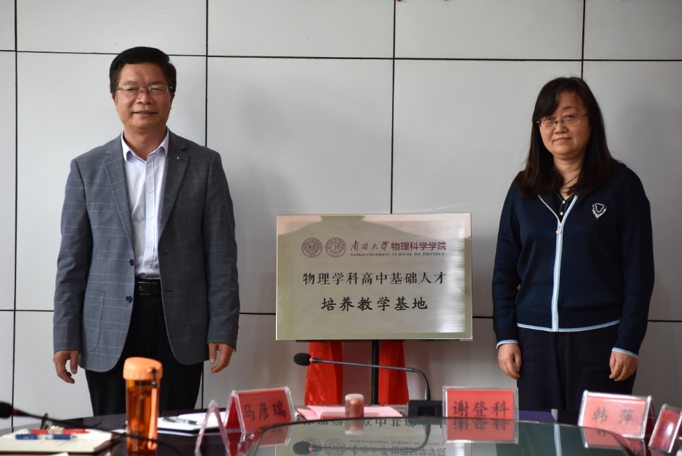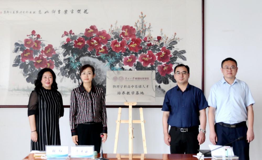 江苏省清河中学党委书记校长颜廷发、副校长于秀权共同为性爱视频 性爱视频 共建物理学科高中基础人才培养教学基地进行揭牌