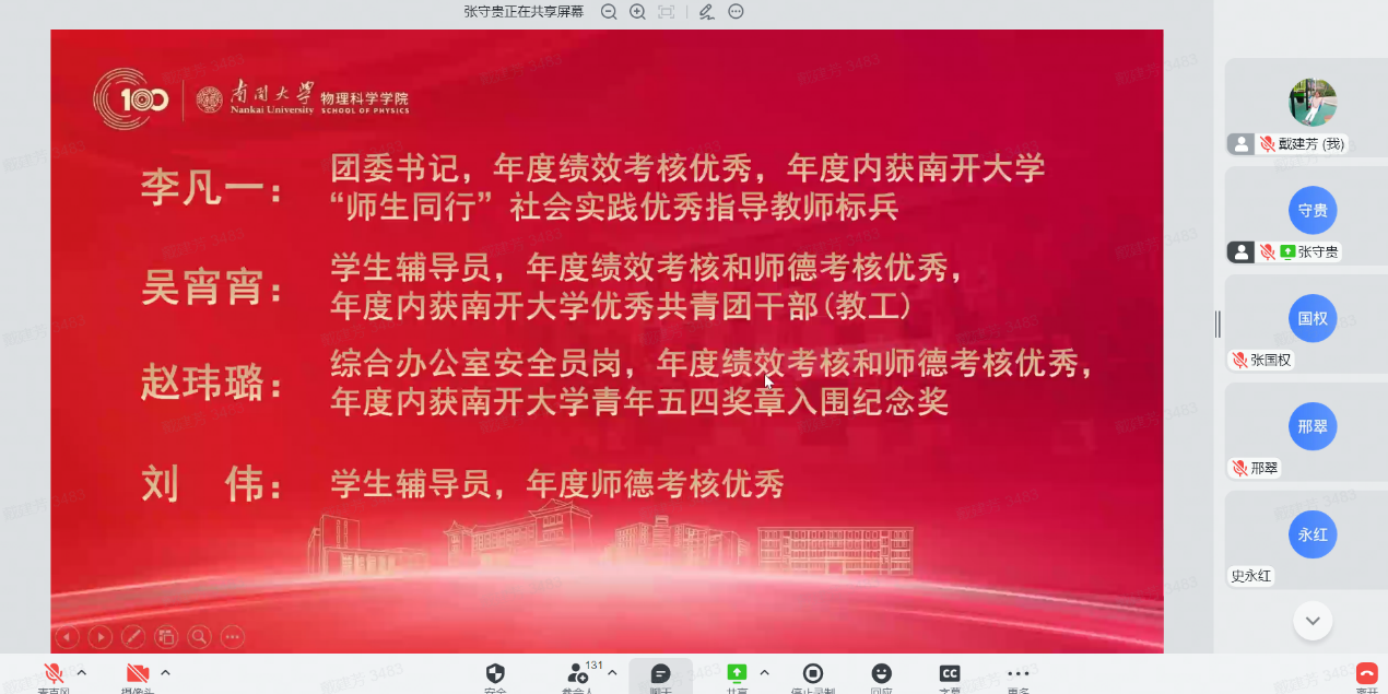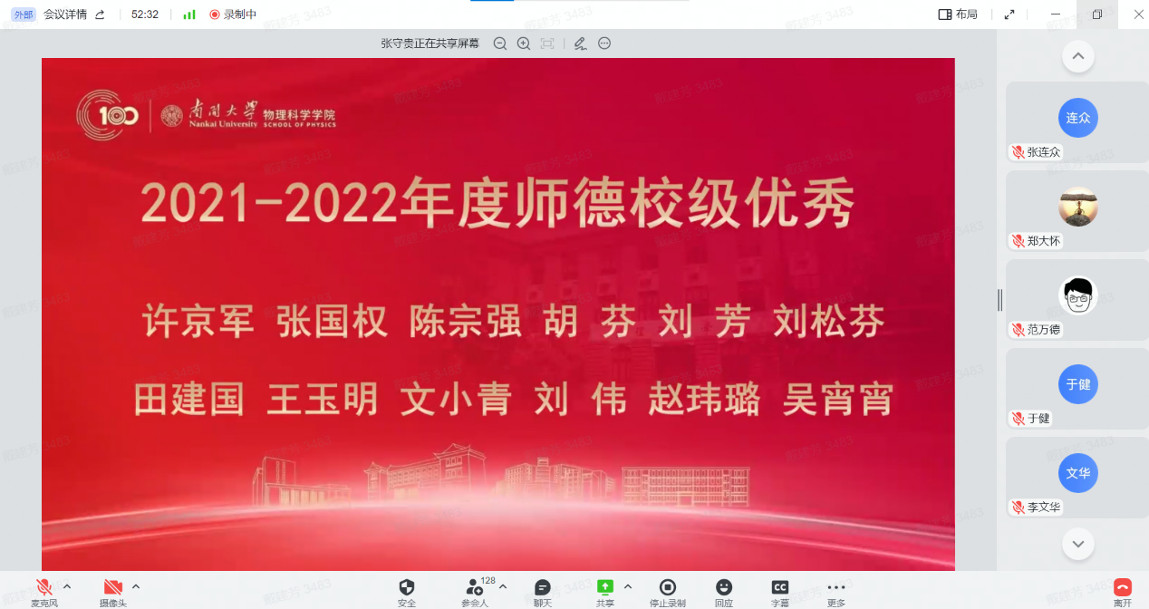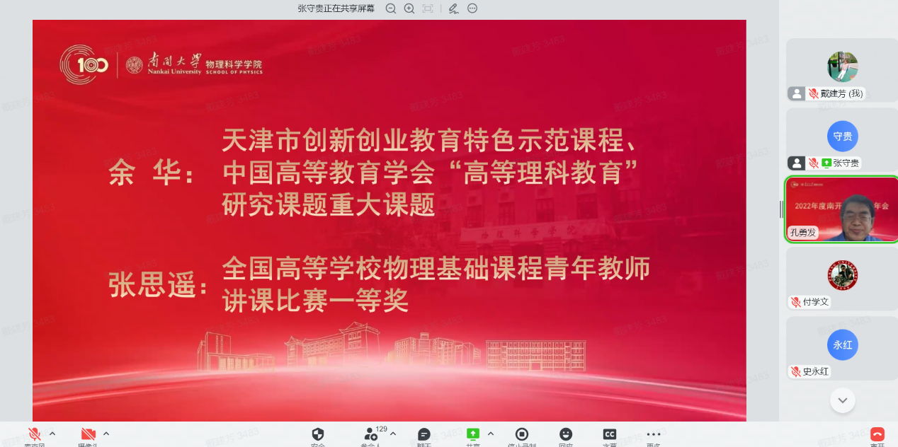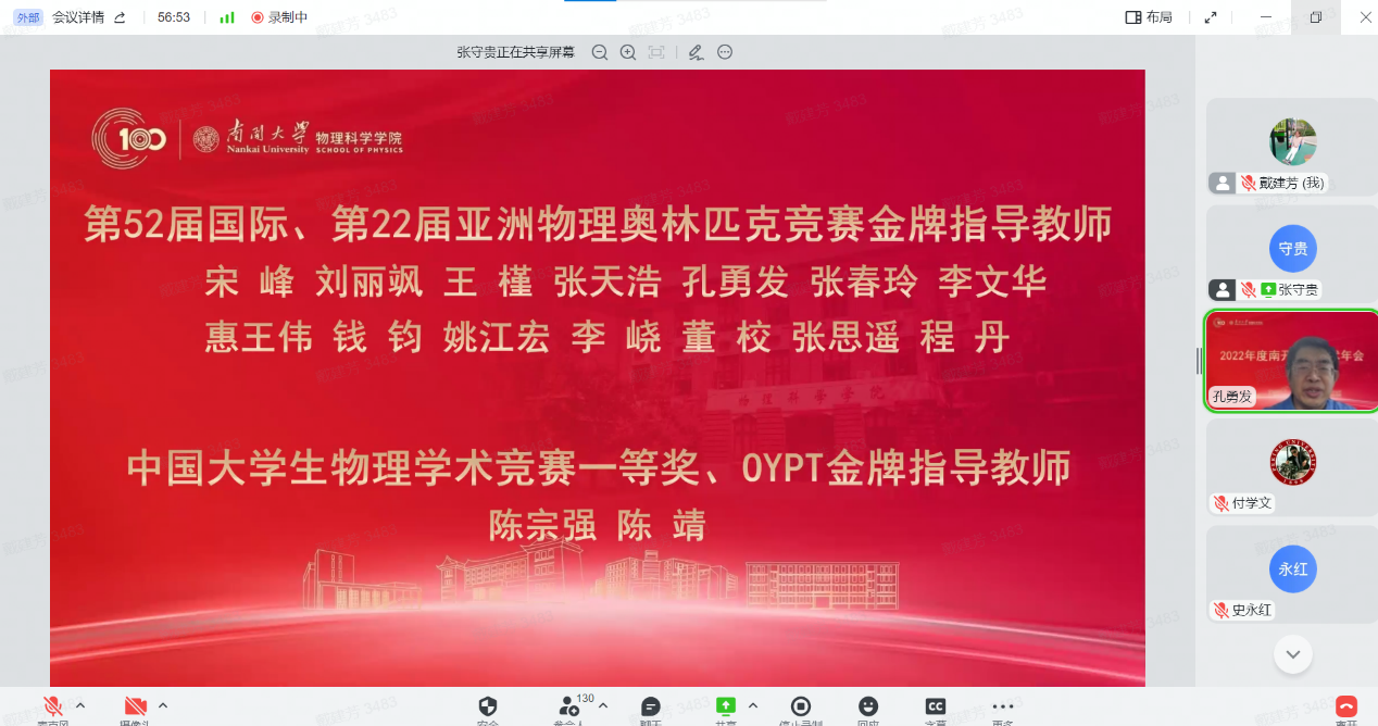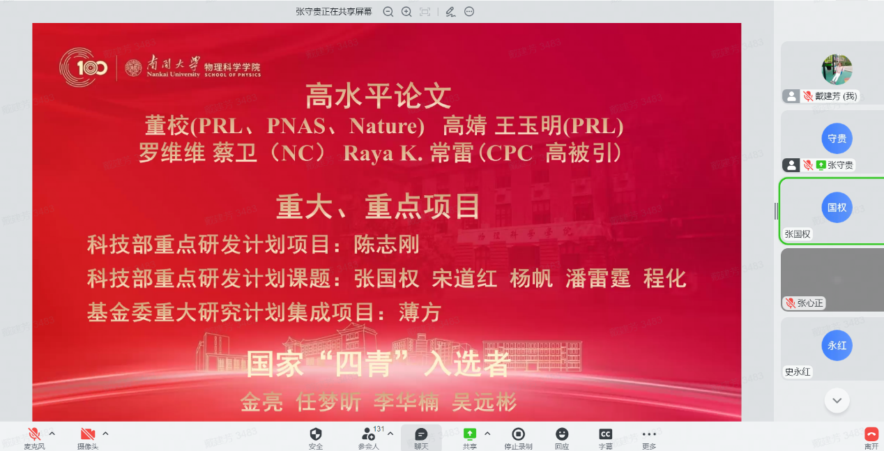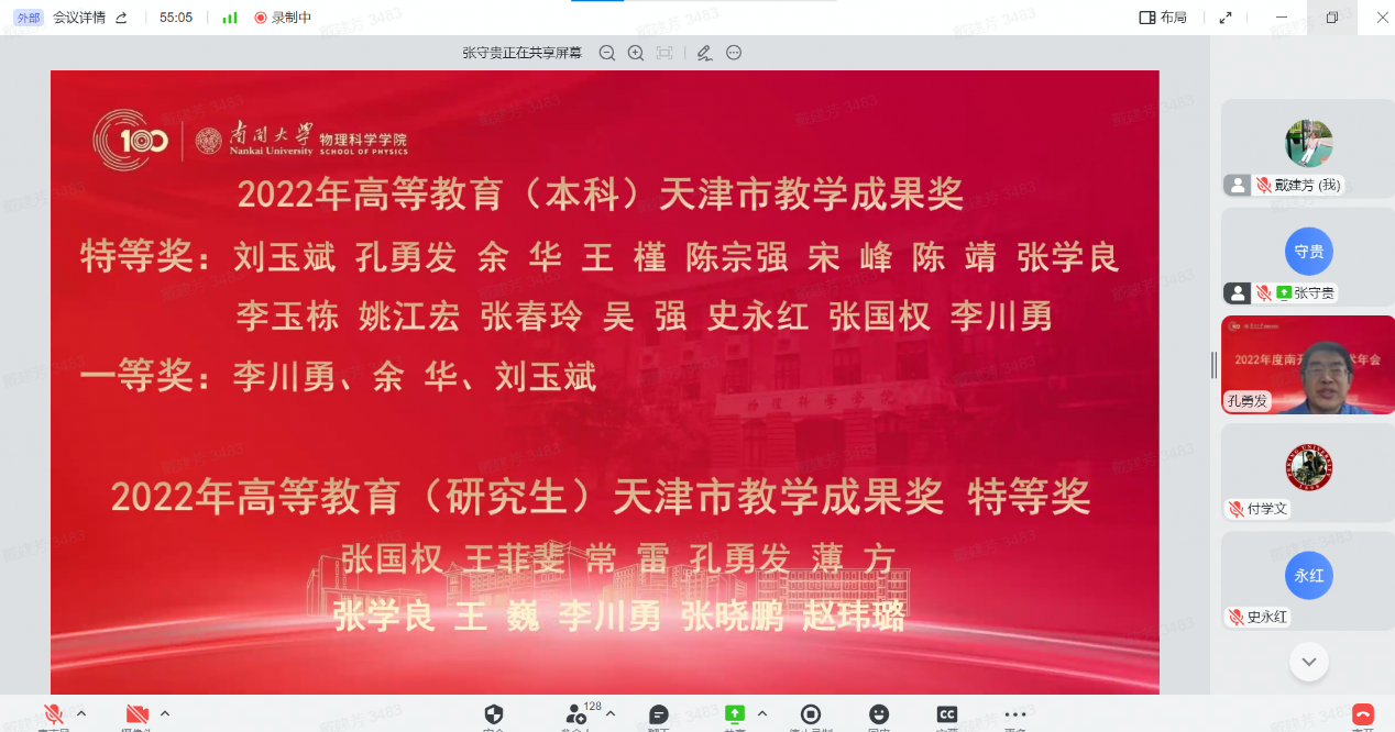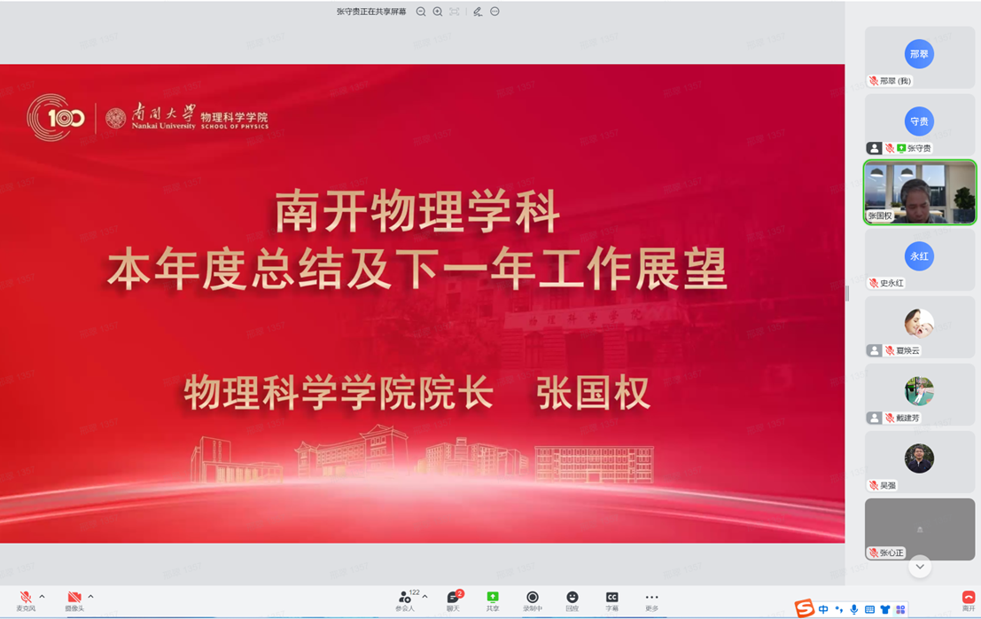 12月30日,性爱视频 全院教师大会暨2022年南开物理学术年会成功举办,全院教师齐聚云端,总结经验,表彰先进,谋划未来,凝聚共识,性爱视频 和泰达应用物理研究院全体教师和博士后130余人参加,学院党委书记史永红主持开幕式。