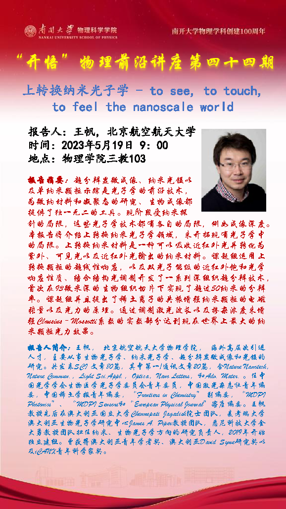 【“开悟”物理前沿讲座(第 44期)】上转换纳米光子学 - to see, to touch, to feel the nanoscale world