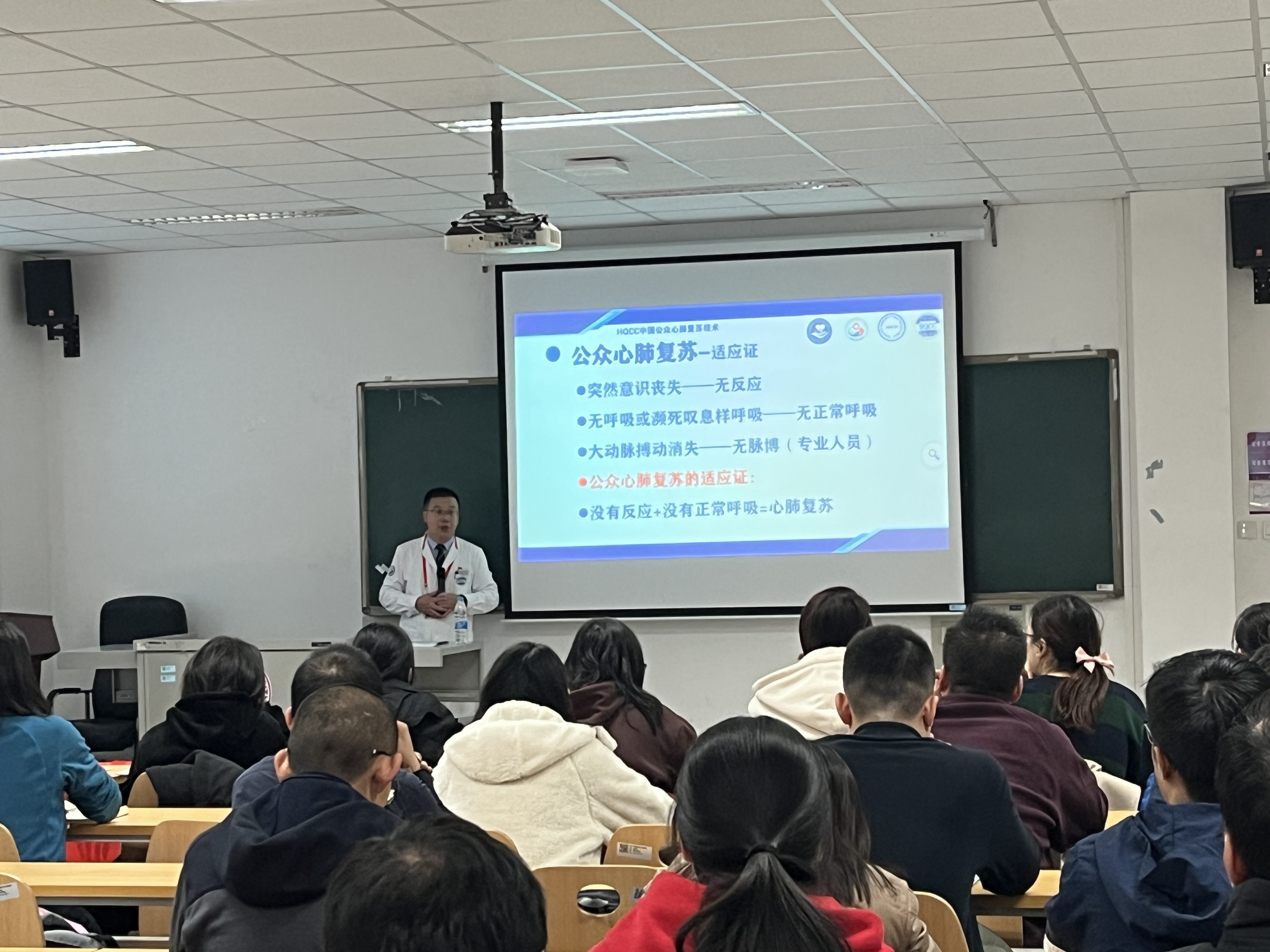 活动现场,三中心医院教学办公室主任黎俊首先详细介绍了心脏骤停的症状特性与心肺复苏急救重要性。随后临床技能实训中心负责人李雁平带领大家梳理了实施抢救的操作流程,以及自动体外除颤器(AED)使用方法、海姆立克急救技术的发力方式等。在接下来的实训环节,指导老师利用假人教具还原真实场景,现场分解演示,与会师生依次进行实际操作,每个人都亲身体会到急救的全过程和具体操作细节。急救团队老师从旁指导纠正动作,精彩的讲解和一对一的指导让大家获益匪浅。