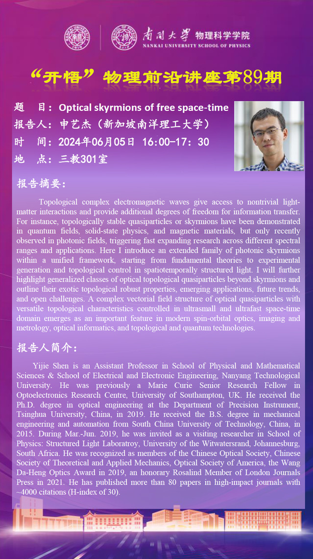 【“开悟”物理前沿讲座 (第89期)】Optical skyrmions of free space-time