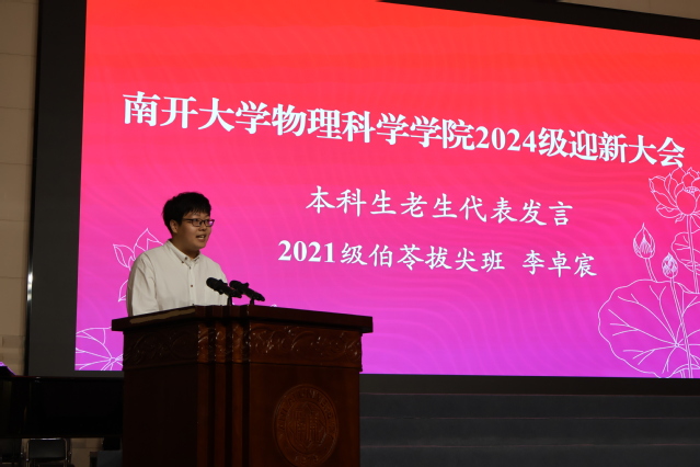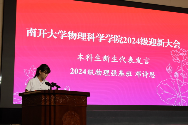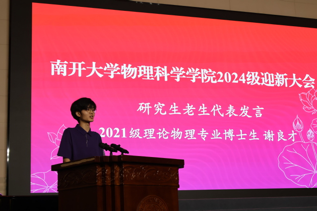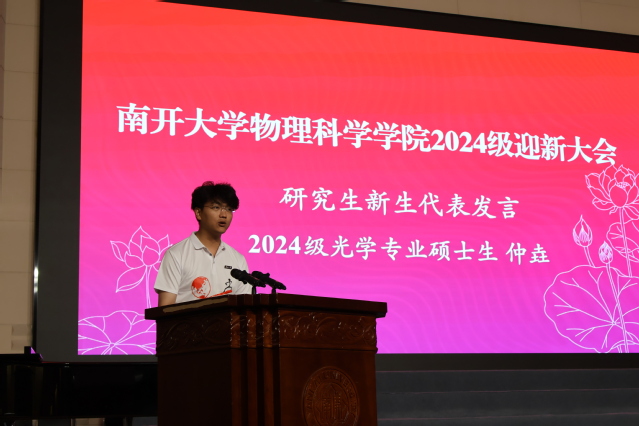 本科生新生代表2024级物理强基班邓诗恩表达了自己对物理学的热爱期待与同学们一道,保持好奇心和探索精神勤奋学习、刻苦钻研关注国家需求、服务社会,挑起振兴祖国科技事业、迎接新技术革命的重担,书写绚丽的青春篇章。研究生新生代表2024级光学专业硕士研究生仲垚与同学们分享了自己面对新阶段的紧张和激动,他希望未来能继续秉公之情怀,炼能之修为,“格物致理,知行合一”的科研实践精神,在学业和科研工作上拼搏进取,踔厉奋发,展现南开人不惧挑战,“越难越开”的科研精神,在新的起点上跑出当年青年的最好成绩,成为南开新的骄傲。