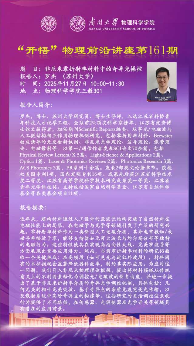 【“开悟” 物理前沿讲座 (第161期)】非厄米零折射率材料中的奇异光操控