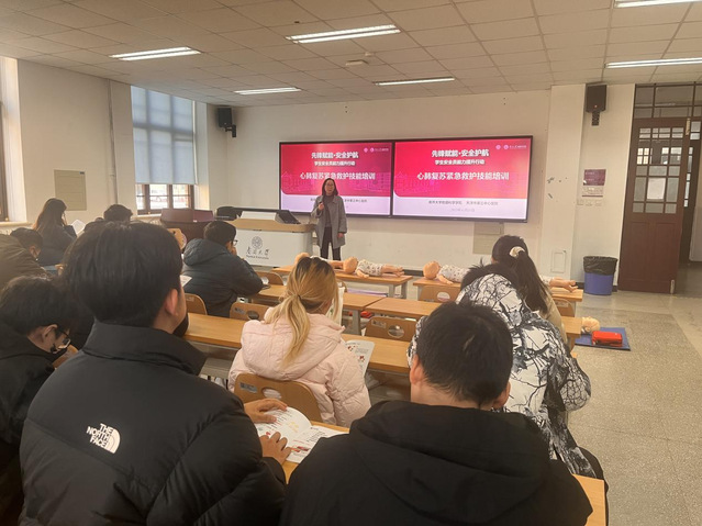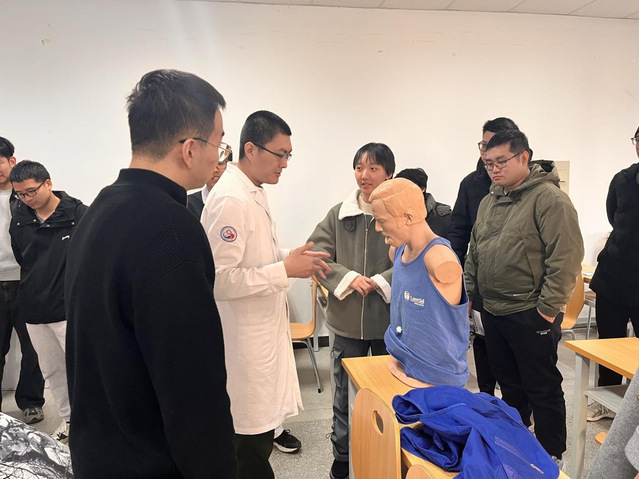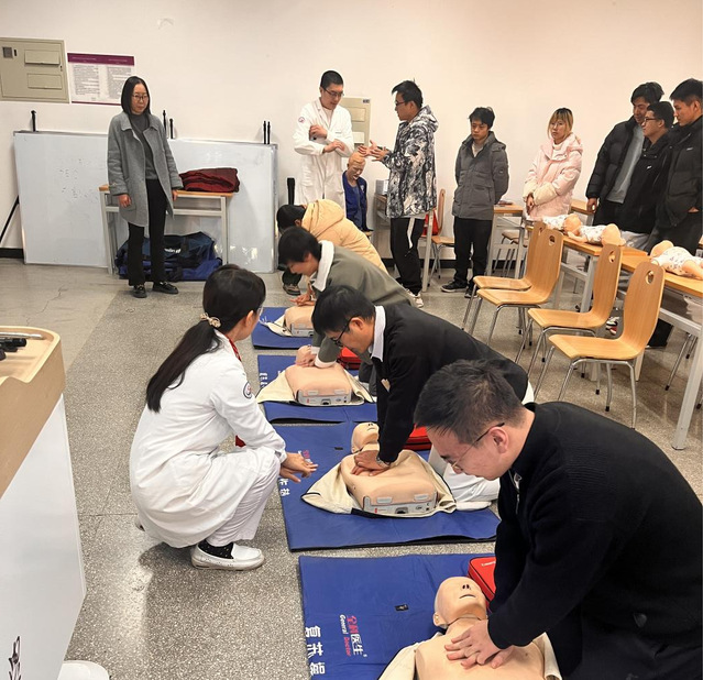 培训由天津市公众心肺复苏急救科普基地主任李雁萍主讲。李老师详细讲解了心肺复苏抢救的操作流程,以及自动体外除颤器(AED)使用方法、海姆立克急救技术的正确方式等。在接下来的实训环节,指导老师利用假人教具还原真实场景,现场指导心肺复苏的操作。老师和同学们轮流进行操作,重点练习胸外按压的定位、深度、频率,以及气道异物梗阻时站立位、卧位的操作技巧。通过培训活动,学员们深刻理解了急救措施的原理和应用场景,消除了面对紧急情况时的紧张与无措。