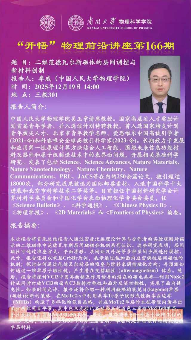 【“开悟” 物理前沿讲座 (第166期)】二维范德瓦尔斯磁体的层间调控与新材料创制