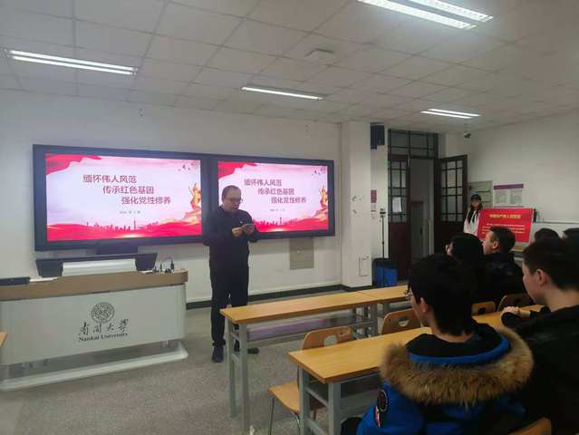 首先,师生根据影像回顾周总理革命生涯与崇高风范,团委书记在讲话中倡议将缅怀之情转化为奋进动力,践行南开校训。随后,全体师生共同学习《我的修养要则》,党员同志面向党旗重温入党誓词,强化使命担当。