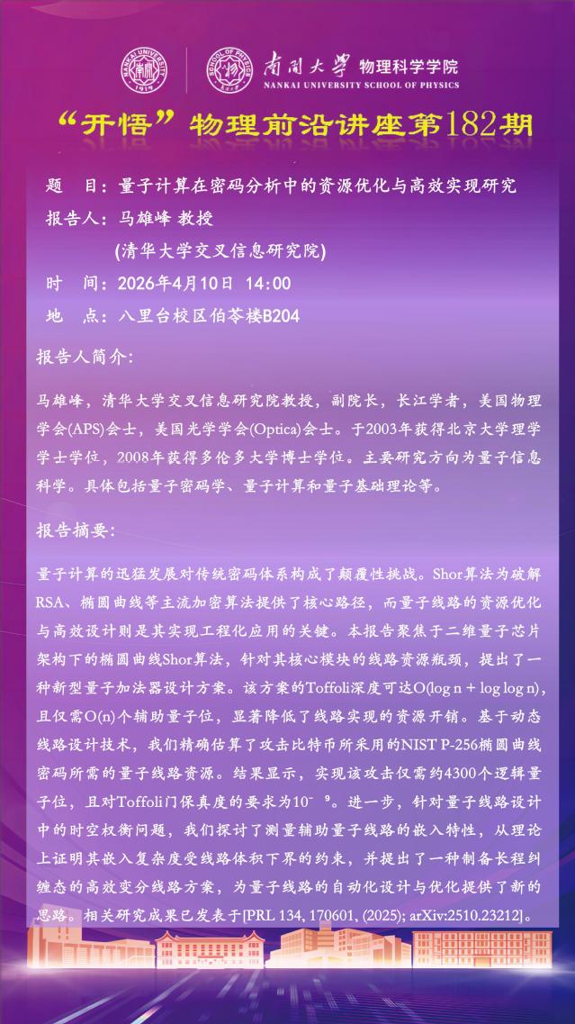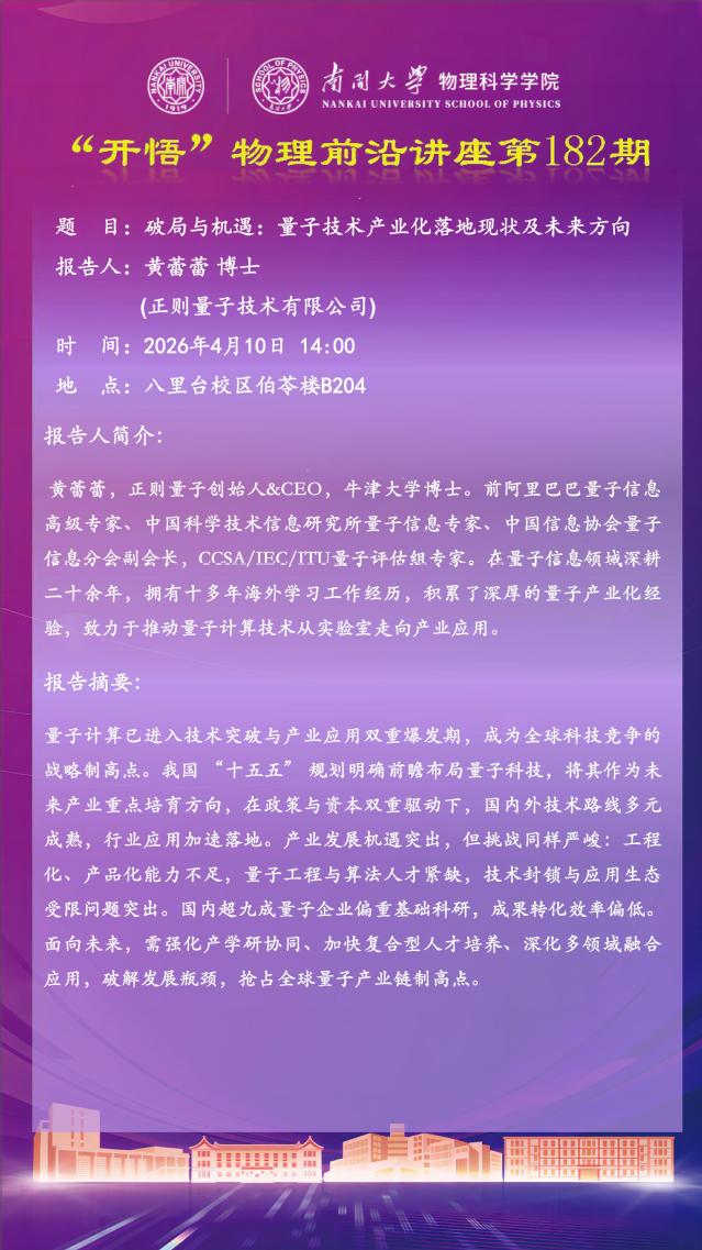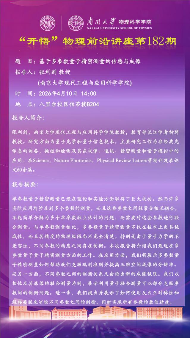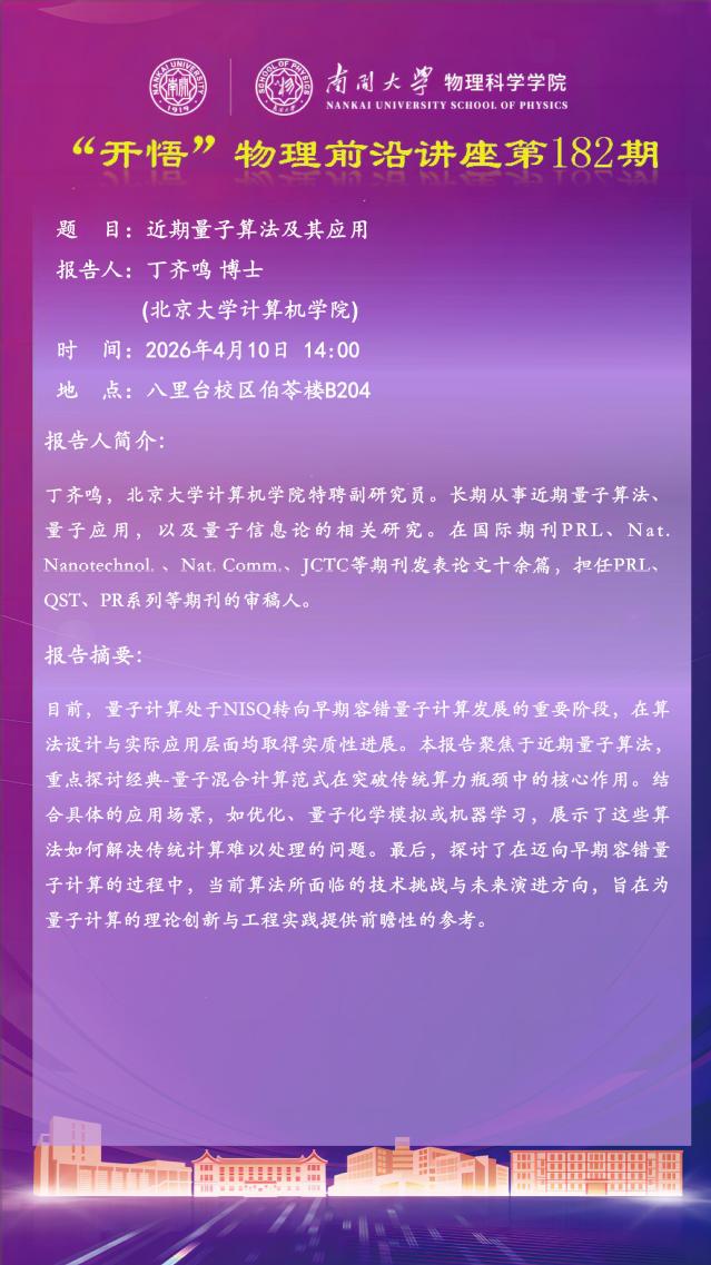 【“开悟” 物理前沿讲座 (第182期)】量子计算在密码分子中的资源优化与高校实现研究;基于多参数量子精密测量的传感与成像;量子技术产业化落地现状及未来方向;近期量子算法及其应用
