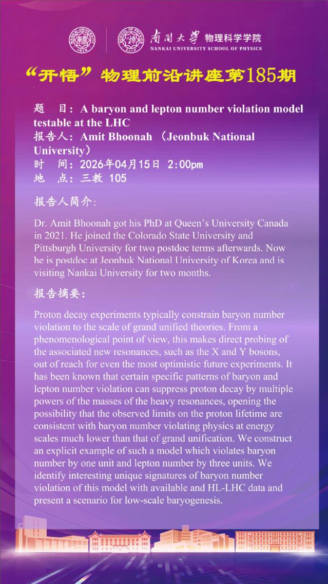 【“开悟” 物理前沿讲座 (第185期)】A baryon and lepton number violation model testable at the LHC