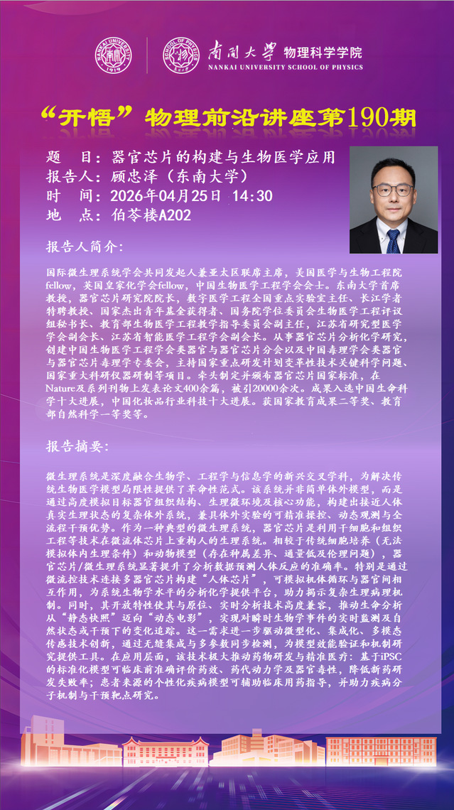 【“开悟” 物理前沿讲座 (第190期)】器官芯片的构建与生物医学应用