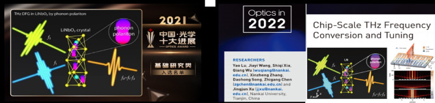 中国光学十大进展(基础研究类)与美国光学学会Optics in 2022入选截图 通过仔细分析离子晶体材料中离子与电子各自的性质与它们之间的相互作用关系,我们可以构建出一套以离子晶体和太赫兹声子极化激元为中心的全新的研究体系,以促进其他众多学科的发展。这一系列研究提出了极性晶体中独特的LMI机制,因为不依赖BO近似,为光和晶体相互作用提供了新的可能性。例如,通过直接控制离子,这种机制能够更有效地调制极性晶体的光学性质和畴结构,这打破了仅控制电子非常有限的调制的限制。我们的发现不仅对光学和光子器件的发展很重要,而且可能对理解凝聚态物理学中其它基于极化激元的现象也很重要。 (2)太赫兹瞬态亚波长光子学与超快现象 电子学和光子学的发展日益完善,使得科研工作者们把目光集中在频段介于两者之间曾经被称为“太赫兹空白”的太赫兹技术和科学。利用亚波长铌酸锂晶片作为基质材料,我们实现了太赫兹波的产生、传输、调控、探测、与物质或微结构的相互作用等功能。在这个研究中,铌酸锂晶片的厚度远小于太赫兹波长,同时又是含时间变化的瞬态研究,所以需要开发亚波长瞬态光学的基本方程和理解其特性,以利于功能器件的设计。为了能够精细观测芯片上太赫兹波的作用过程,需要开发时空超分辨的定量成像技术。在以上理论和技术的基础上,我们利用商用软件开发了基于时域有限差分和有限元的数值设计和模拟系统,并开发了片上超材料制备工艺和片上微结构加工工艺。