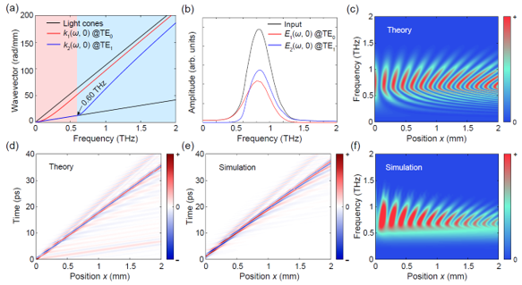 “共线模间”干涉原理【待更新】 铌酸锂片上的太赫兹集成器件的基础是各向异性亚波长平板波导,也就是作为基底材料的铌酸锂晶片中太赫兹波传输的性质。我们借助时空超分辨成像实验系统,系统研究了瞬态亚波长情形下的一系列光学效应,并实现了对片上太赫兹波传输模式、模式动态转化、相位调制、能量分布调制、以及非对称传输等。这些基础工作为研究瞬态亚波长光学和光子学中的新物理提供了引导,同时也为未来铌酸锂片上太赫兹应用提供了借鉴。