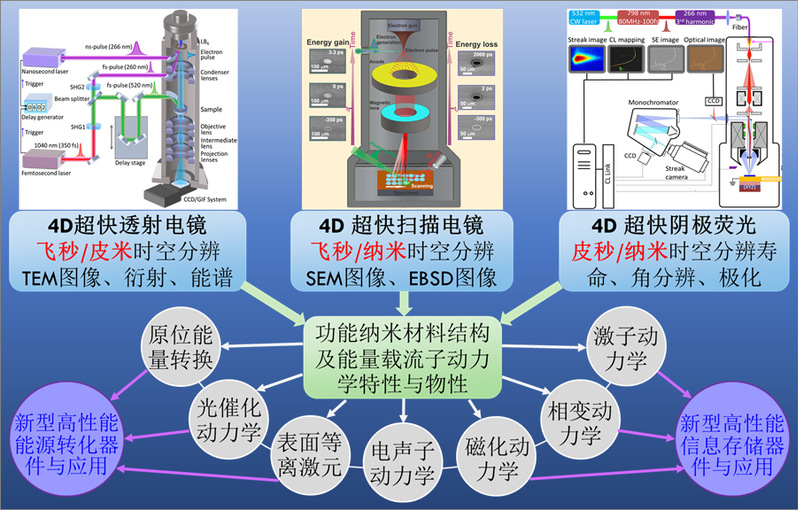 研究方向研究领域简介 物质的微观结构及其相关动力学行为从根本上决定了其物理与化学性质及潜在的功能和应用。例如功能纳米材料和人工纳米结构在能源转化、信息存储等应用中发挥作用时,其微观结构都发生着一系列复杂的物理和化学变化,涉及到形貌演化、结构相变、电荷转移、价态变化等动力学过程。这些动力学过程许多发生在飞秒(10-15 s)至纳秒(10-9 s)尺度。因此,在原子、分子尺度实时地观察物质微观结构的超快动力学过程一直是材料、物理、化学和生物等研究领域追逐的目标,也是深入理解其物性和开发新产品的关键。4D超快电子显微镜结合了电镜的超高空间分辨率和飞秒激光的超快时间分辨率,为研究物质的微观结构及其相关动力学行为提供了无限可能。其自2005年于加州理工学院(Caltech)诺奖得主Ahmed Zewail教授课题组诞生以来,已经在上述多个研究领域产生众多重要应用,成为电子显微学领域一个快速发展的新兴方向。 在性爱视频 的大力支持下,我们建立了一个国际一流的综合性4D超快电子显微镜实验室,自主设计搭建了最新一代的4D超快透射电子显微镜(4D UTEM)、超快扫描电子显微镜(USEM)、超快阴极荧光(TRCL)、微区瞬态光谱及成像(TA/TRPL)、时间分辨的磁光探测(TR-MOKE,RMCD)等超高时空分辨电子、光子成像与探测系统,旨在探索最小和最快的未知微观世界。课题组长期从事4D超快电子显微镜技术和原子/纳米尺度的超快动力学及物理研究,重点关注和发展先进的新型原位4D UTEM、USEM、TRCL、TAM、TR-MOKE等超高时空分辨的电子、光子成像与探测技术,在空前的时空尺度下研究量子与纳米功能材料在能源转换、信息存储与传输等真实应用中的形貌及晶体结构演化、能量载流子传输与相互作用等超快动力学过程与物理机制,进而开发新器件和新应用。