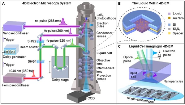 2)通过进一步优化该原位4D技术的性能,研究了水中纳米金颗粒在飞秒激光作用下表面等离激元激发与光热能量转化等动力学过程。首次在纳秒和纳米时空尺度下观察到了纳米金颗粒周围表面等离激元纳米气泡的产生、膨胀和湮灭过程,以及纳米金颗粒在此纳米气泡驱动下的弹道输运和随机游走等动力学行为,提出了一种针对液体环境中纳米机器人的光诱导等离激元气泡驱动机制 (Science Advances 3, e1701160 (2017); ACS nano 15 (4), 6801-6810 (2021))。并进一步成功捕捉到了水中纳米金颗粒之间表面等离激元诱导的团聚与熔合等不可逆物理与化学反应超快动力学过程 (J. Phys. Chem. Lett. 9, 4045(2018))以及GaAs纳米线/金纳米球体系的多元共金反应不可逆超快动力学过程(Proc. Natl. Acad. Sci. U.S.A. 201708761(2017);Nano Letters19 (2), 781-786 (2019))。