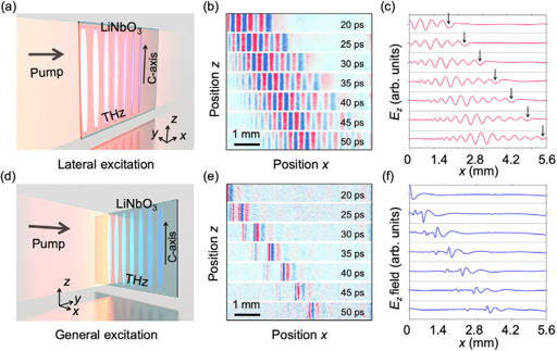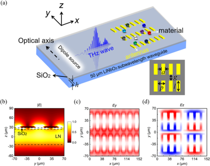 中国光学十大进展(基础研究类)与美国光学学会Optics in 2022入选截图 通过仔细分析离子晶体材料中离子与电子各自的性质与它们之间的相互作用关系,我们可以构建出一套以离子晶体和太赫兹声子极化激元为中心的全新的研究体系,以促进其他众多学科的发展。这一系列研究提出了极性晶体中独特的LMI机制,因为不依赖BO近似,为光和晶体相互作用提供了新的可能性。例如,通过直接控制离子,这种机制能够更有效地调制极性晶体的光学性质和畴结构,这打破了仅控制电子非常有限的调制的限制。我们的发现不仅对光学和光子器件的发展很重要,而且可能对理解凝聚态物理学中其它基于极化激元的现象也很重要。 (2)太赫兹瞬态亚波长光子学与超快现象 电子学和光子学的发展日益完善,使得科研工作者们把目光集中在频段介于两者之间曾经被称为“太赫兹空白”的太赫兹技术和科学。利用亚波长铌酸锂晶片作为基质材料,我们实现了太赫兹波的产生、传输、调控、探测、与物质或微结构的相互作用等功能。在这个研究中,铌酸锂晶片的厚度远小于太赫兹波长,同时又是含时间变化的瞬态研究,所以需要开发亚波长瞬态光学的基本方程和理解其特性,以利于功能器件的设计。为了能够精细观测芯片上太赫兹波的作用过程,需要开发时空超分辨的定量成像技术。在以上理论和技术的基础上,我们利用商用软件开发了基于时域有限差分和有限元的数值设计和模拟系统,并开发了片上超材料制备工艺和片上微结构加工工艺。