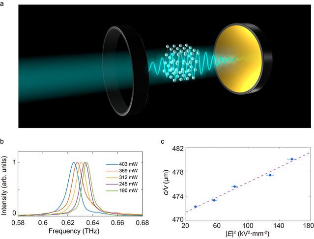 新型光与物质相互作用机制图解【非绝热情形Commun Phys-2022】 此外,面对太赫兹光通讯、光计算、光子学实用化器件等等的重大需求,如何在切实可用材料中实现强克尔效应至关重要。作者团队设计并利用飞秒直写技术在铌酸锂平板波导上制作了单一模式太赫兹法布里-珀罗微腔,观测到了微腔中共振峰随着泵浦功率大小的改变而移动。他们建立了频率移动模型,提取出了受激声子极化激元介导的太赫兹克尔非线性系数,相较于铌酸锂在可见波段的克尔非线性系数,实现了4个数量级的提升(论文Light: Science & Applications 13, 212 (2024) )。